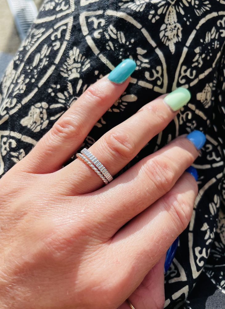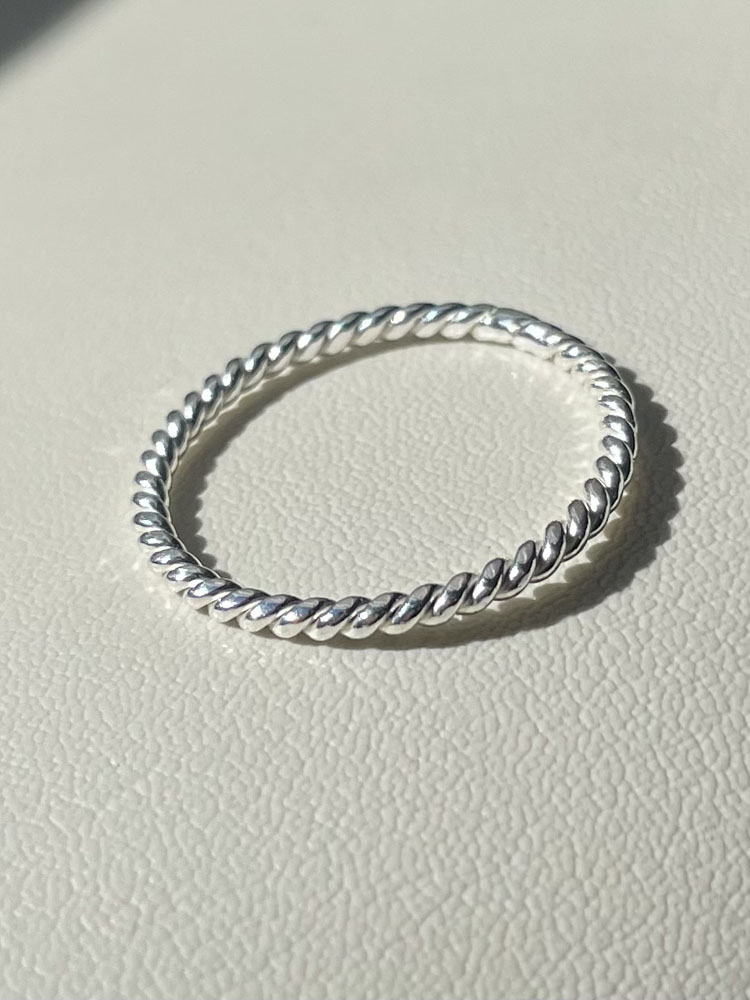 Entièrement réalisée en argent 925, elle se distingue par son fil délicatement torsadé, fin et lumineux. D’un millimètre à peine, elle apporte une touche subtile d’élégance à la main — un bijou discret mais plein de caractère.