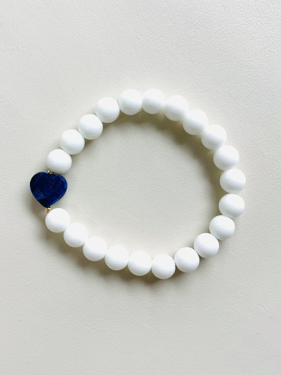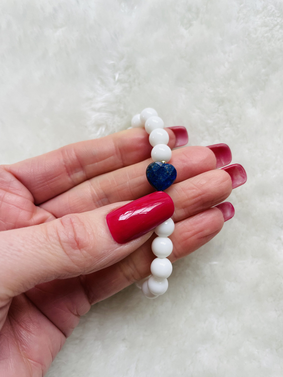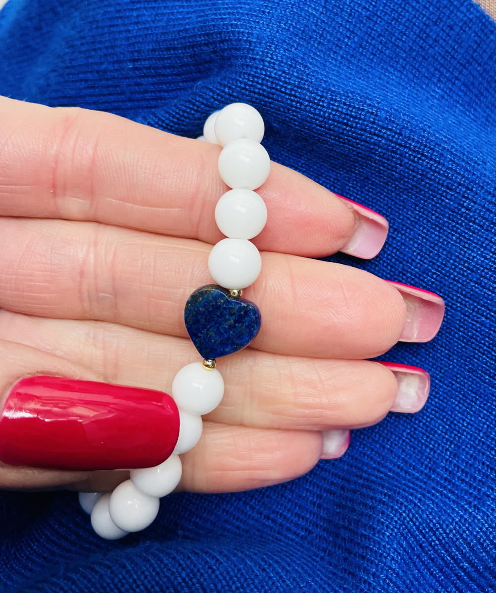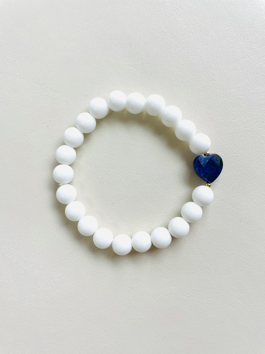 💙 Un bracelet au style symbolique et intemporel en agate blanche naturelle, sublimé par un cœur facetté en lapis-lazuli.