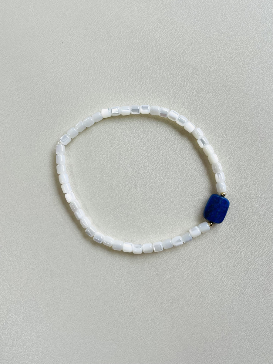 Ce bracelet associe la délicatesse des perles de nacre blanche à l’intensité profonde du lapis-lazuli.