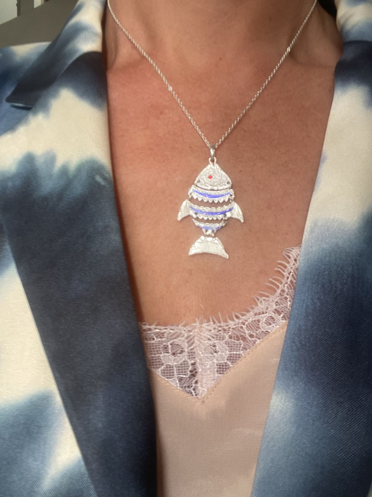 Suspendu à une chaîne fine en argent 925, le médaillon en forme de poisson évoque la fluidité, la liberté et la chance. Ses détails en céramique colorée lui confèrent une touche artisanale et poétique, typique de l’univers Sansar.